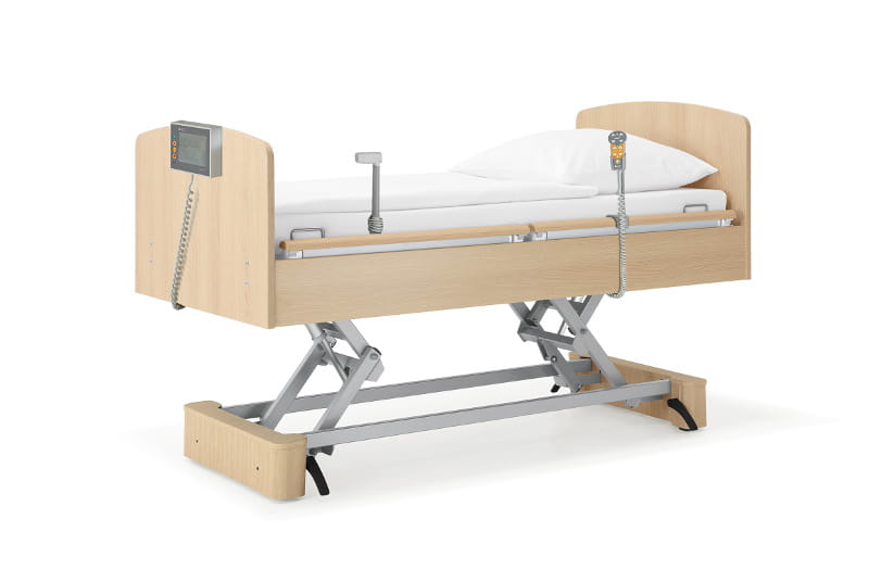 Una cama geriátrica, baja, universal, de alta tecnología, con especial atención a la prevención de caídas, la profilaxis de úlceras de decúbito y la movilización.